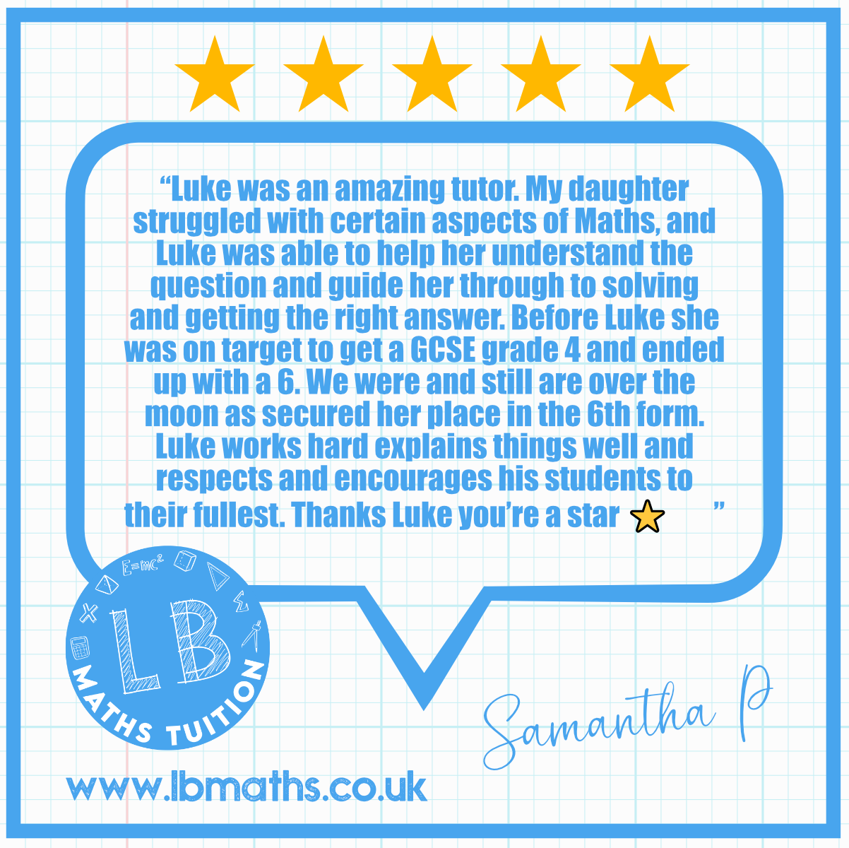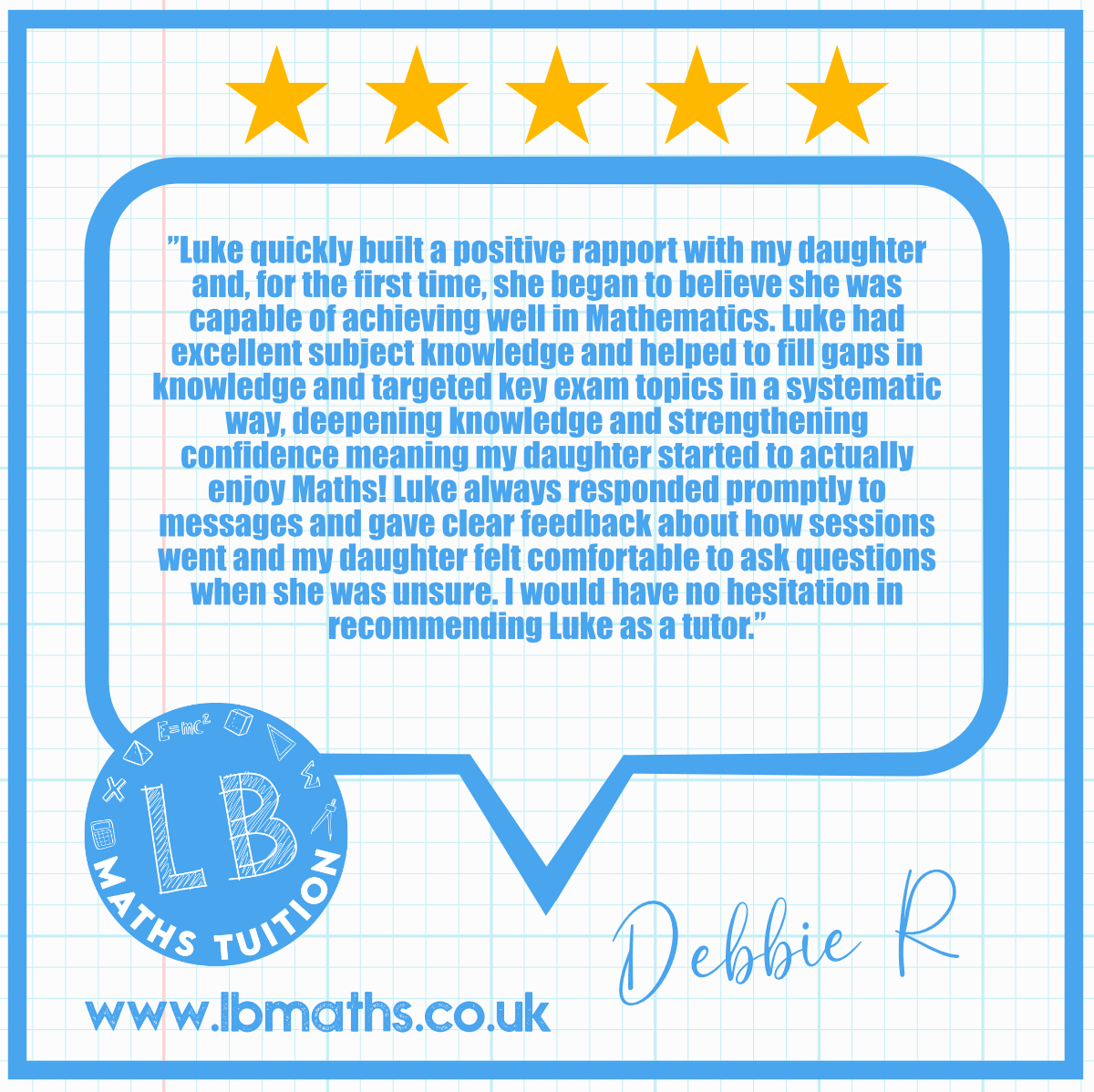 ”I couldn’t recommend you enough. Lillie went from a level 5 to level 8 in just one year. Her self confidence grew, as you taught her not only maths but to believe in herself.”