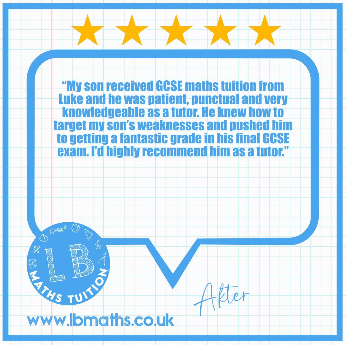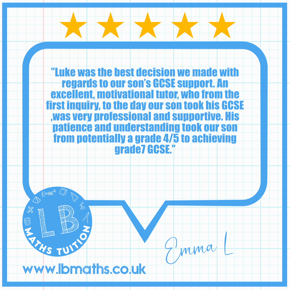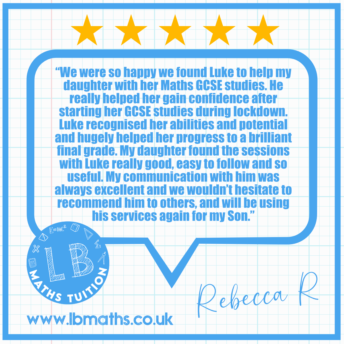 “My son was struggling with maths GCSE syllabus & we weren’t confident he would gain his qualification. With Luke’s help & guidance our son’s confidence & ability grew & he gained a strong pass in his maths, I would happily recommend him to anyone looking for support for their child, thanks!”